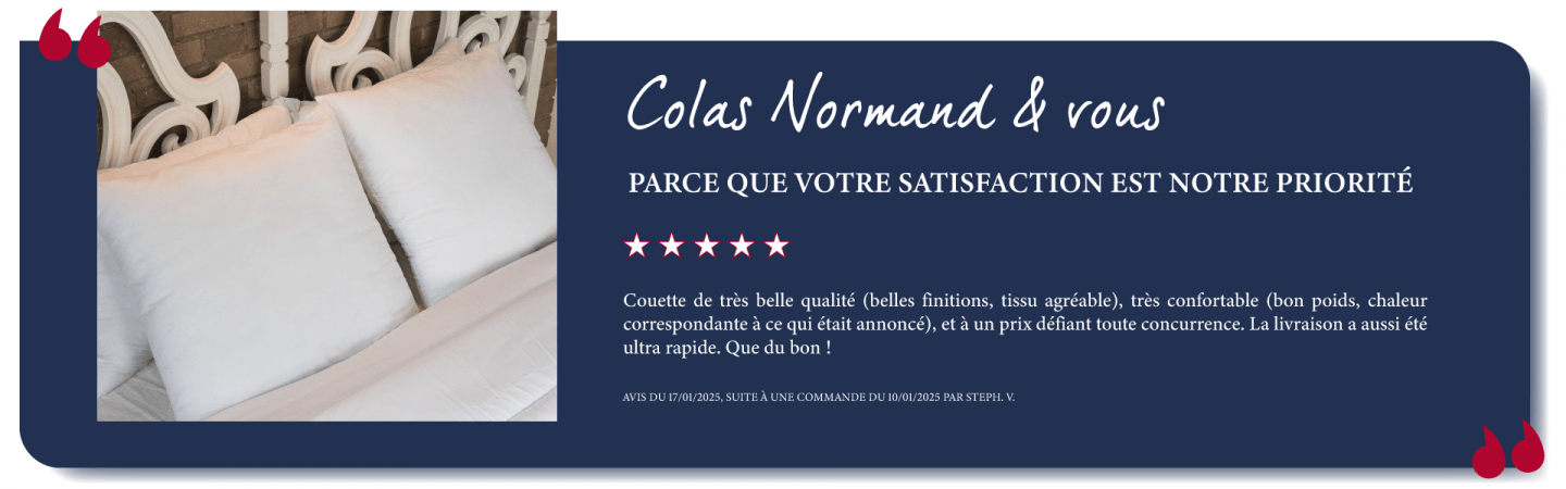 Connaissez-vous cette contrée où règnent les vaches, la crème fraîche, le beurre salé et la pluie ? C’est ici que Colas Normand fabrique chaque jour ses oreillers et couettes. Notre objectif ? Que vous dormiez sur vos deux oreilles et aussi bien qu'à l'hôtel grâce à nos produits fabriqués en Normandie !