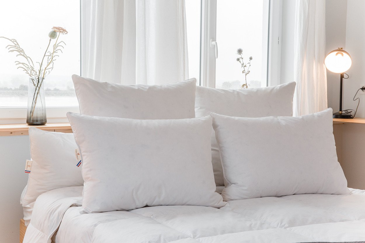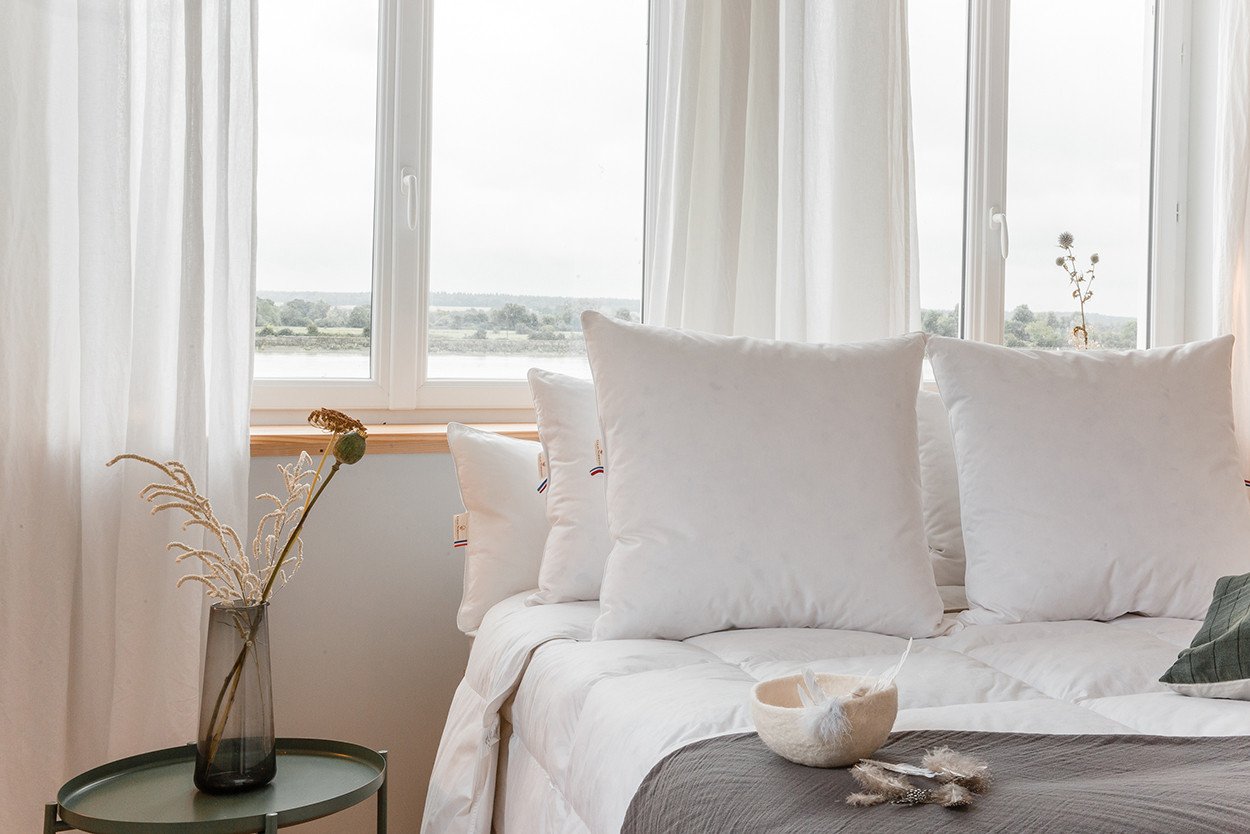 Les plumes et duvets de nos couettes sont issus d’une démarche d’upcycling de déchets de l’industrie agroalimentaire locale et présentent un faible impact environnemental. Les plumes récoltées à l’état brut sont triées, lavées, dépoussiérées dans une manufacture de l’Ouest de la France pour offrir à nos oreillers des qualités de gonflant et de légèreté exceptionnelles.